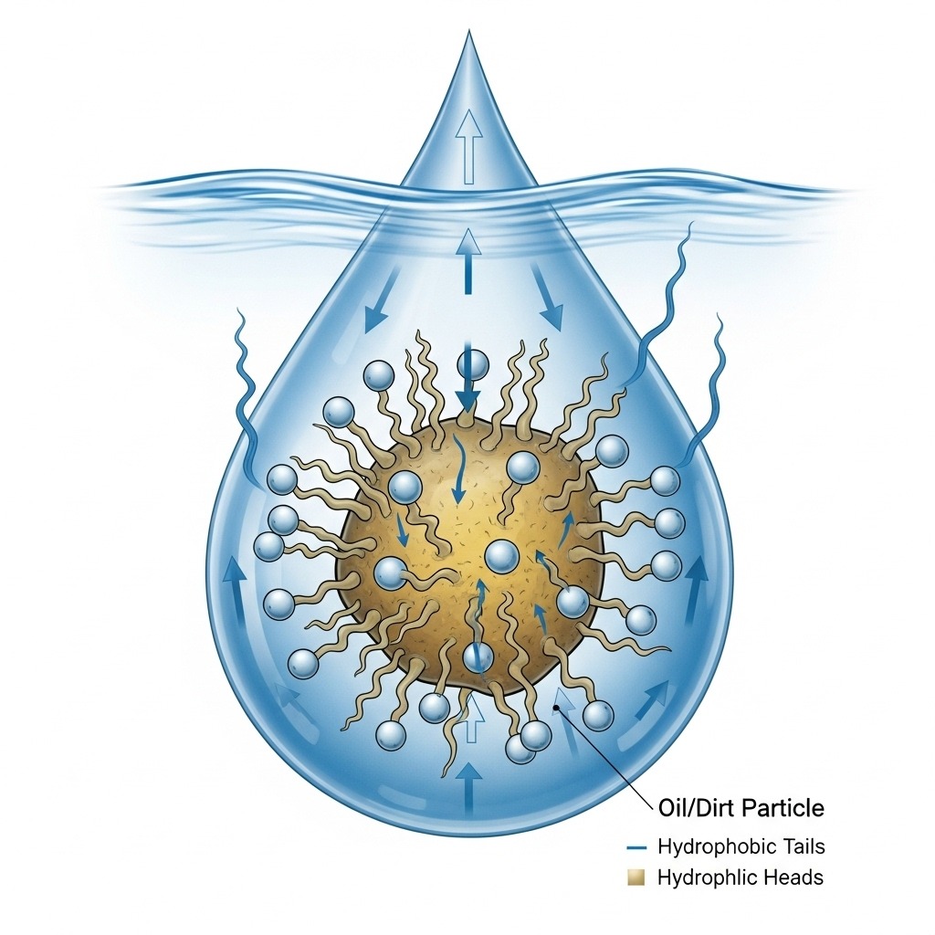 우리가 비누로 손을 씻으면, 수많은 비누 분자의 꼬리 부분이 피부의 기름때(오염물질)에 달라붙어 감싸버려요. 그리고 물과 친한 머리 부분은 바깥쪽을 향해 동그란 공 모양의 ‘미셀(Micelle)’이라는 구조를 만들죠. 이 미셀은 기름때를 가둔 채로 물에 둥둥 떠다니다가, 우리가 물로 헹궈낼 때 함께 씻겨나가는 원리랍니다. 정말 똑똑하지 않나요?